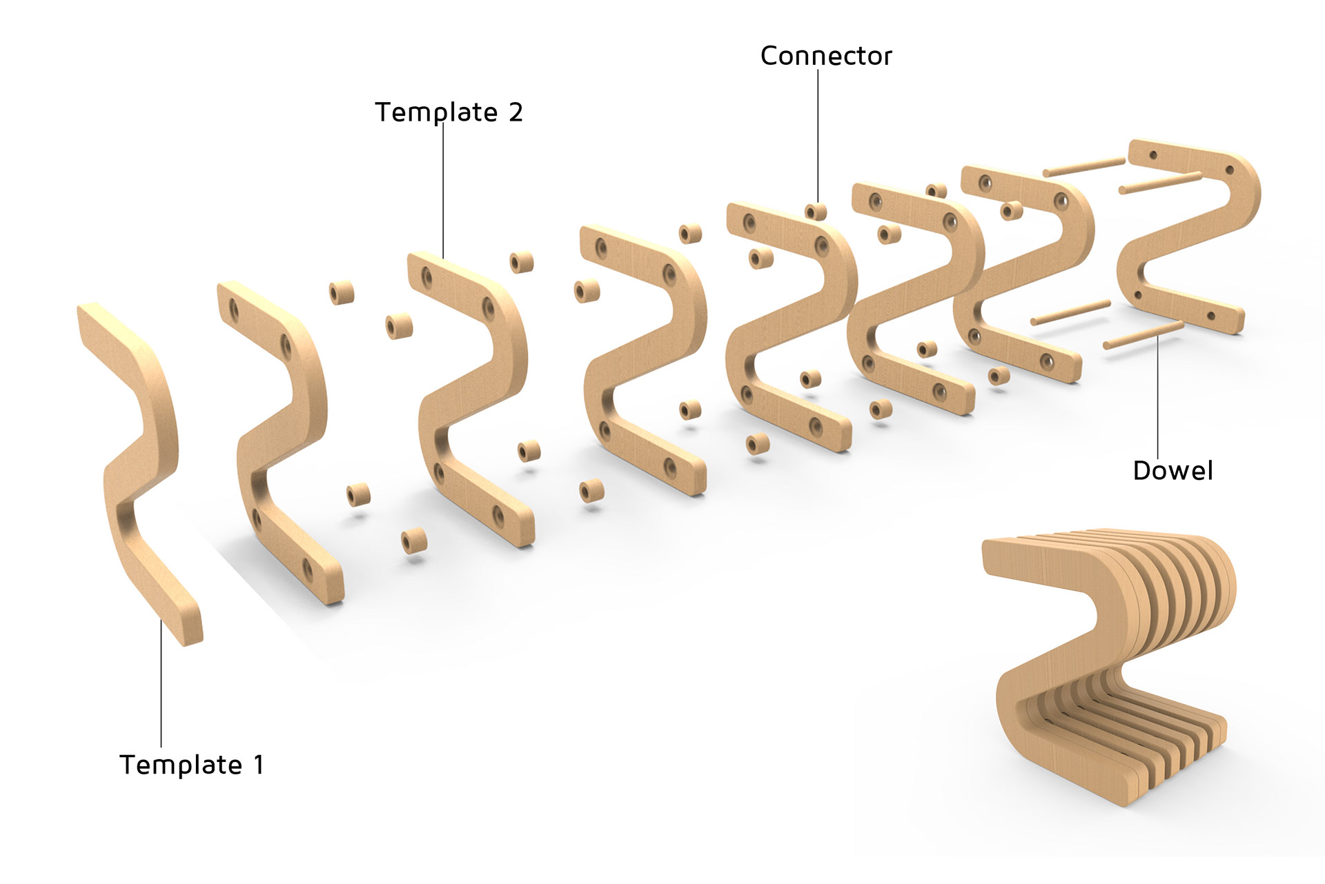 The plan to construct this stool relies on a few templates and dowel, with connector combining the whole structure together.